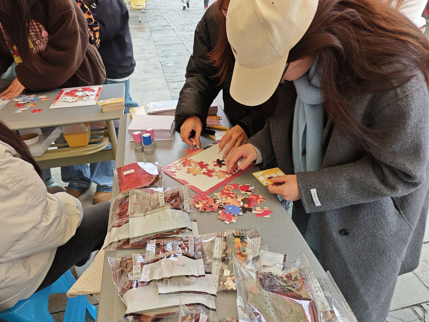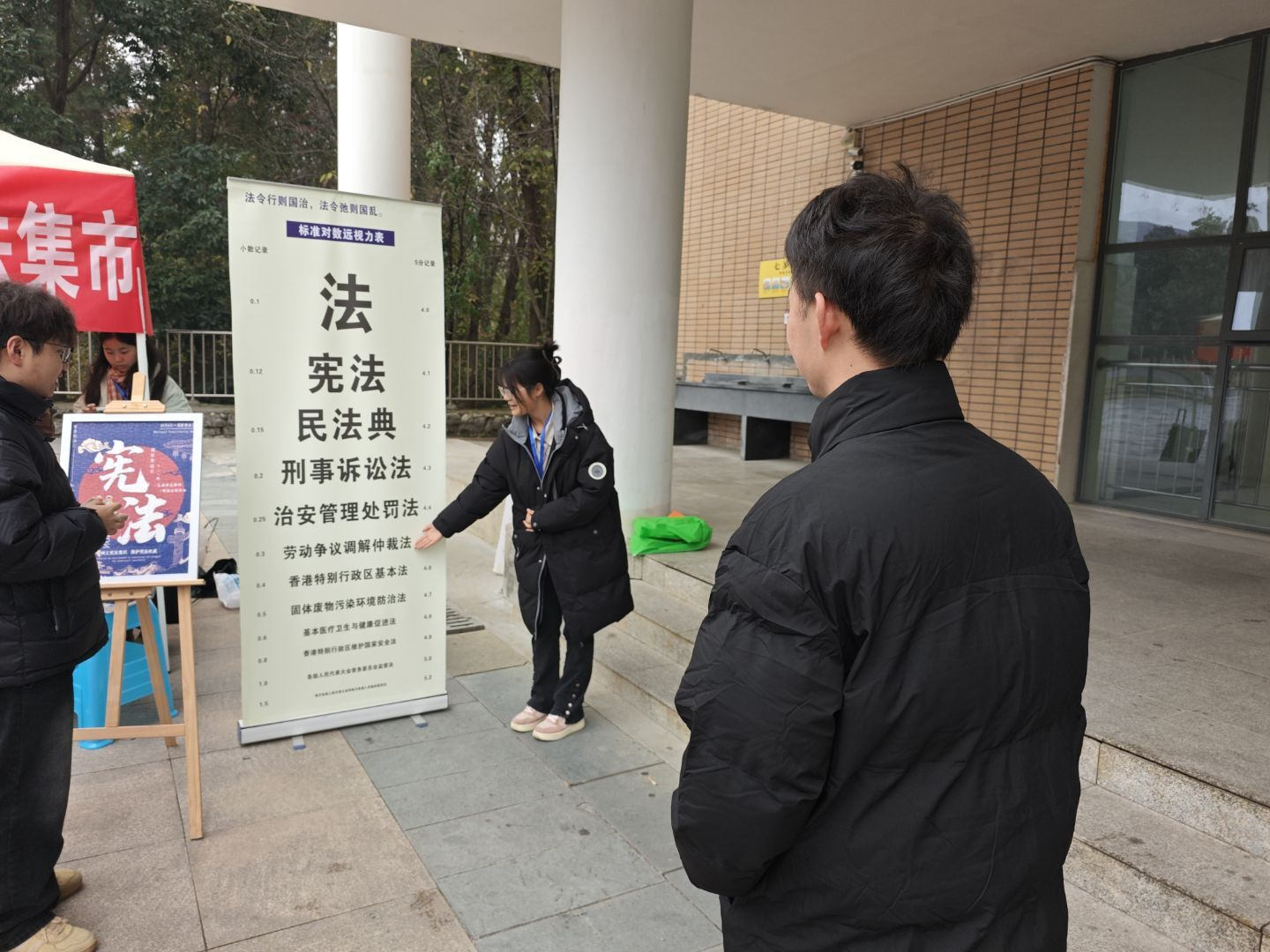 活动以“集章打卡”为主线,参与者领取“普法集市集章卡”后,可依次体验创意普法板块。延续往届经典项目的同时,本届集市新增多个创意模块。“落叶为纸,书写宪法”活动中,同学们拾取秋日落叶,将宪法核心条文书写其上,张贴于“法治叶脉”主题展板,一片片承载着法治信仰的落叶,构成自然之美与法律庄严的和谐图景;“法律公益咨询台”邀请律所律师及学院专业教师组成顾问团,针对“实习协议纠纷”“个人信息保护”等学生高频法律问题提供一对一解答,现场受理咨询20余次。