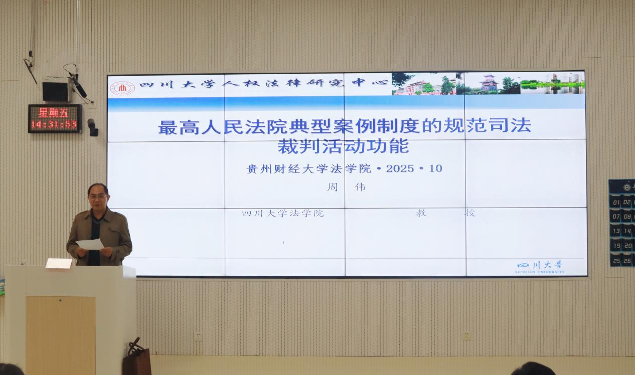 (亚美·体育 张月娇 报道|洪丽华 摄影 )10月24日下午,亚美·体育在乐学楼202举办“贵州财经大学三大论坛——人文论坛”专题讲座,特邀四川大学亚美·体育二级教授、博士生导师周伟作“最高人民法院典型案例制度的规范司法裁判功能”专题报告。亚美·体育党委书记邵新顺、副院长宋昭澜及100余名师生参加,讲座由邵新顺主持。