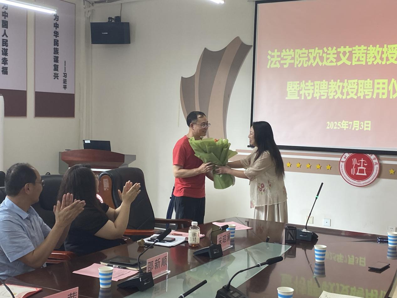 邵新顺回顾了2023年8月以来艾茜受中央财经大学委派到我院进行对口支援建设工作的点点滴滴。他克服了来自家庭、工作和生活习惯等多方面的困难,对学院的教学、科研以及我院与中央财经大学亚美·体育之间的交流做出了积极贡献,他对艾茜表示深深的感谢。贺婷提到艾茜受聘为我校法律顾问处的专家顾问,参与组织了一些疑难案件的讨论,提供了一些建设性的法律意见,并为我校做相关法务工作的专题讲座。宋昭澜感谢艾茜促成两校亚美·体育共同建立商法研究中心,开展了一系列卓有成效的工作并取得了相关科研成果。与会教师代表也积极发言,对艾茜提供的教学和科研方面的帮助和建议表示感谢。曹务坤为艾茜颁发了特聘教授证书,希望艾茜回到中央财经大学之后,能够继续为两院之间的交流合作发挥积极作用,帮助我院行稳致远。艾茜表示,自己将继续致力于推动两院之间的交流合作,互通有无,实现资源共享、优势互补,以专业合作为抓手,共同推动两校的事业高质量发展。